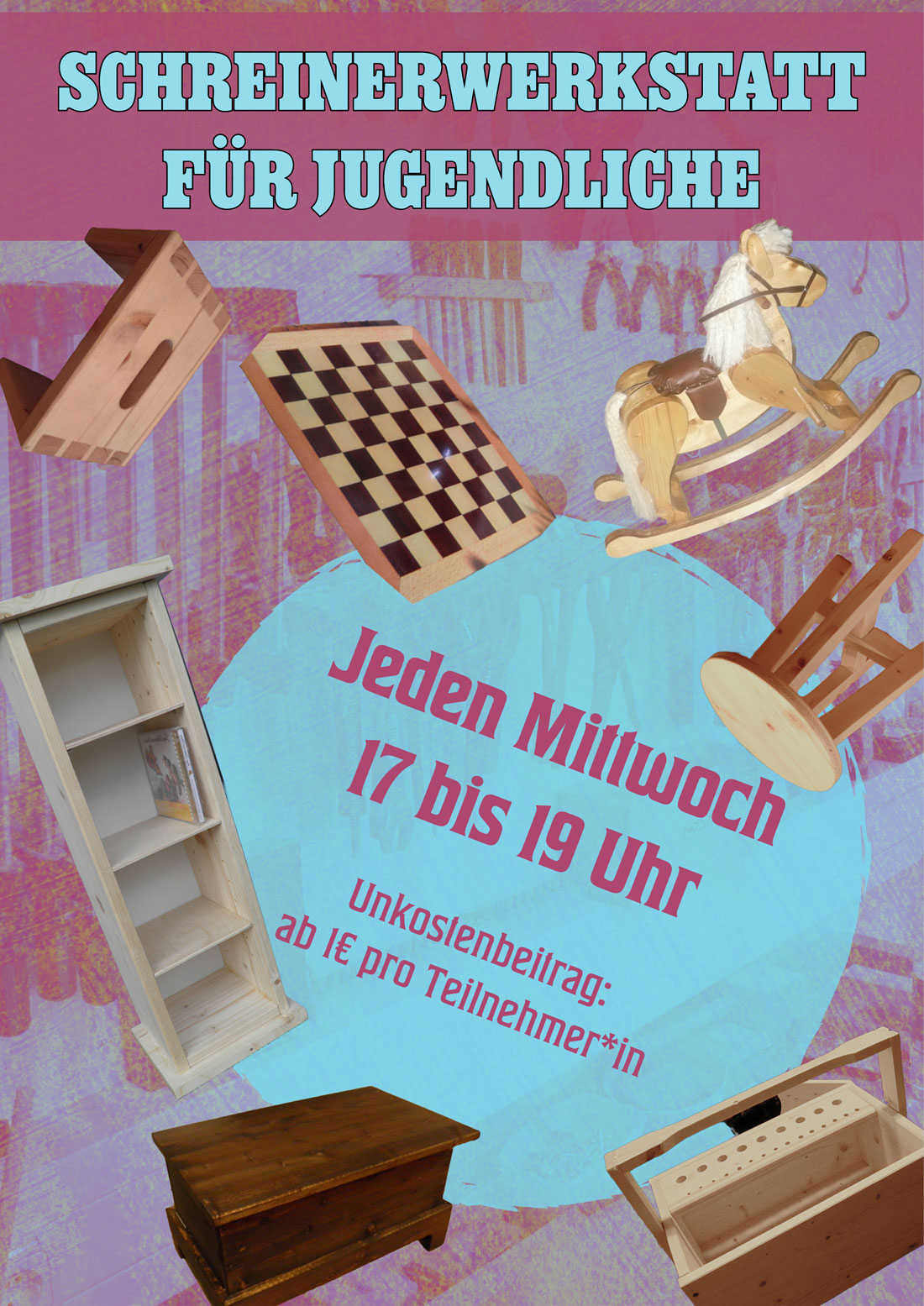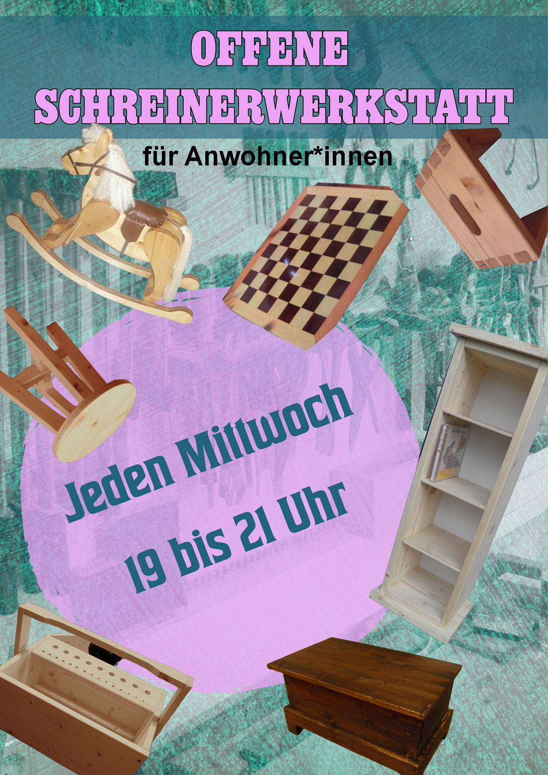 Jeden Mittwoch hat unsere Werkstatt geöffnet. Von 17 bis 19 Uhr finden die offenen Schreinerkurse für Jugendliche statt. Von 19 bis 21 Uhr ist unsere Werkstatt für alle interessierten Anwohner aus dem Stadtteil geöffne